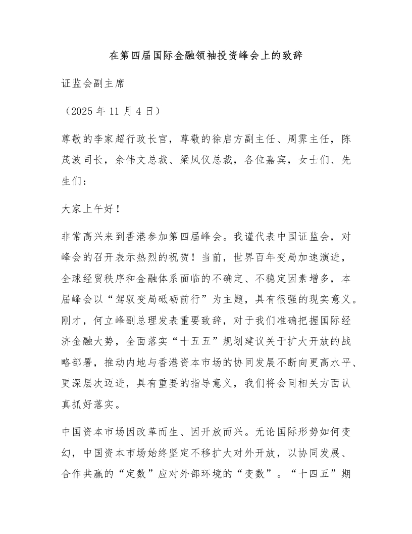 首页材料汇编综合材料在第四届国际金融领袖投资峰会上的致辞