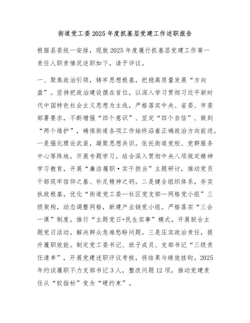 首页党建专栏党建党课街道党工委2025年度抓基层党建工作述职报告