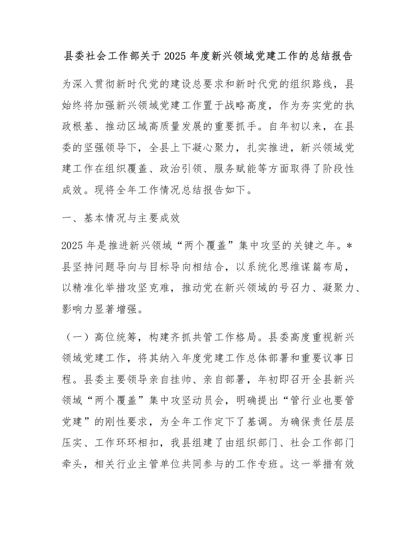 县委社会工作部关于2025年度新兴领域党建工作的总结报告