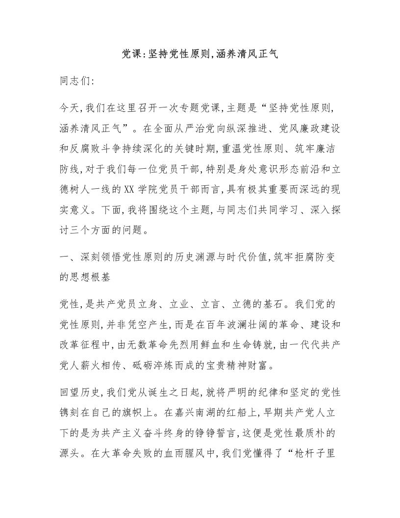 首页党建专栏党课讲稿党课:坚持党性原则,涵养清风正气