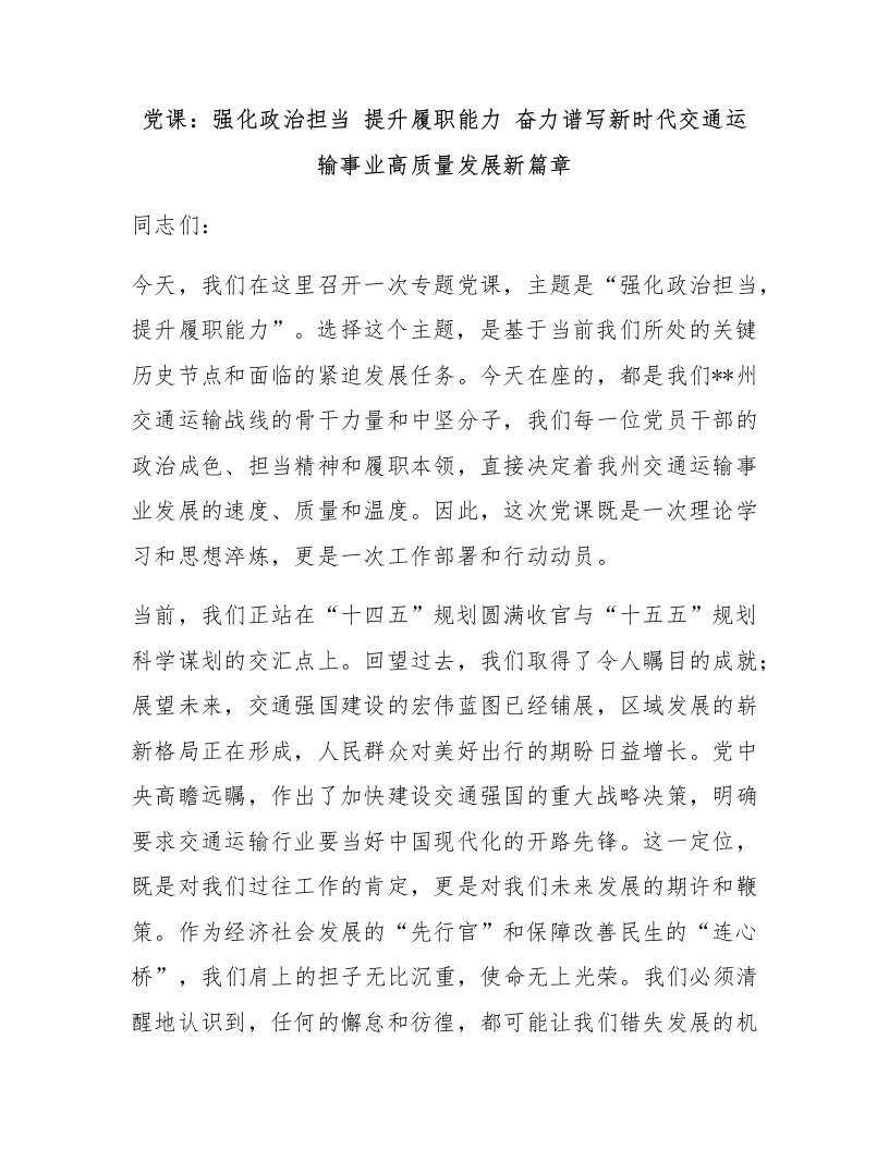 党课:强化政治担当 提升履职能力 奋力谱写新时代交通运输事业高质量发展新篇章