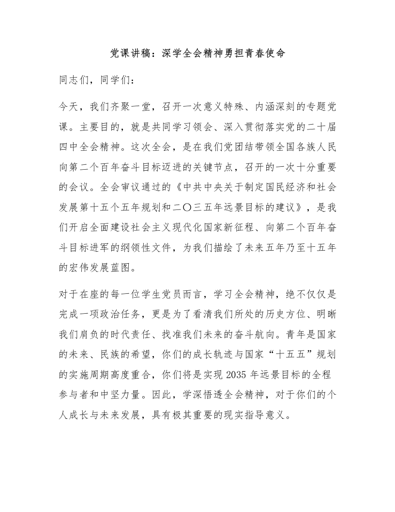 首页党建专栏党课讲稿党课讲稿:深学全会精神勇担青春使命