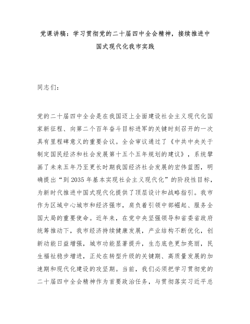 党课讲稿:学习贯彻党的二十届四中全会精神,接续推进中国式现代化我市实践