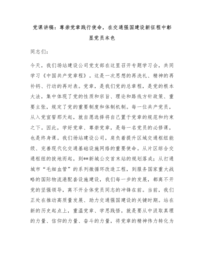 党课讲稿:尊崇党章践行使命,在交通强国建设新征程中彰显党员本色