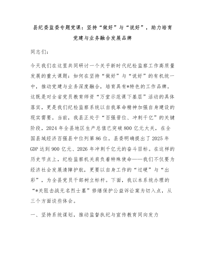 县纪委监委专题党课:坚持“做好”与“说好”,助力培育党建与业务融合发展品牌