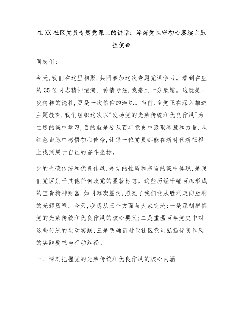 在XX社区党员专题党课上的讲话:淬炼党性守初心赓续血脉担使命
