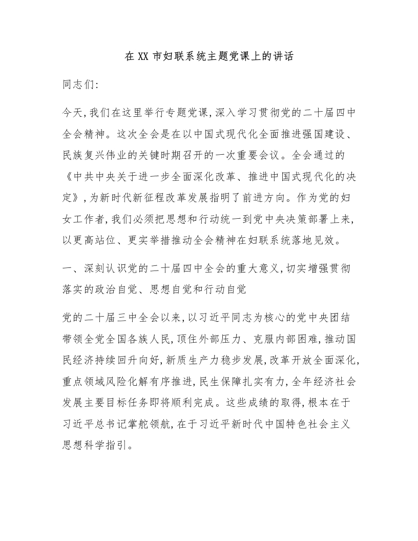 在XX市妇联系统主题党课上的讲话
