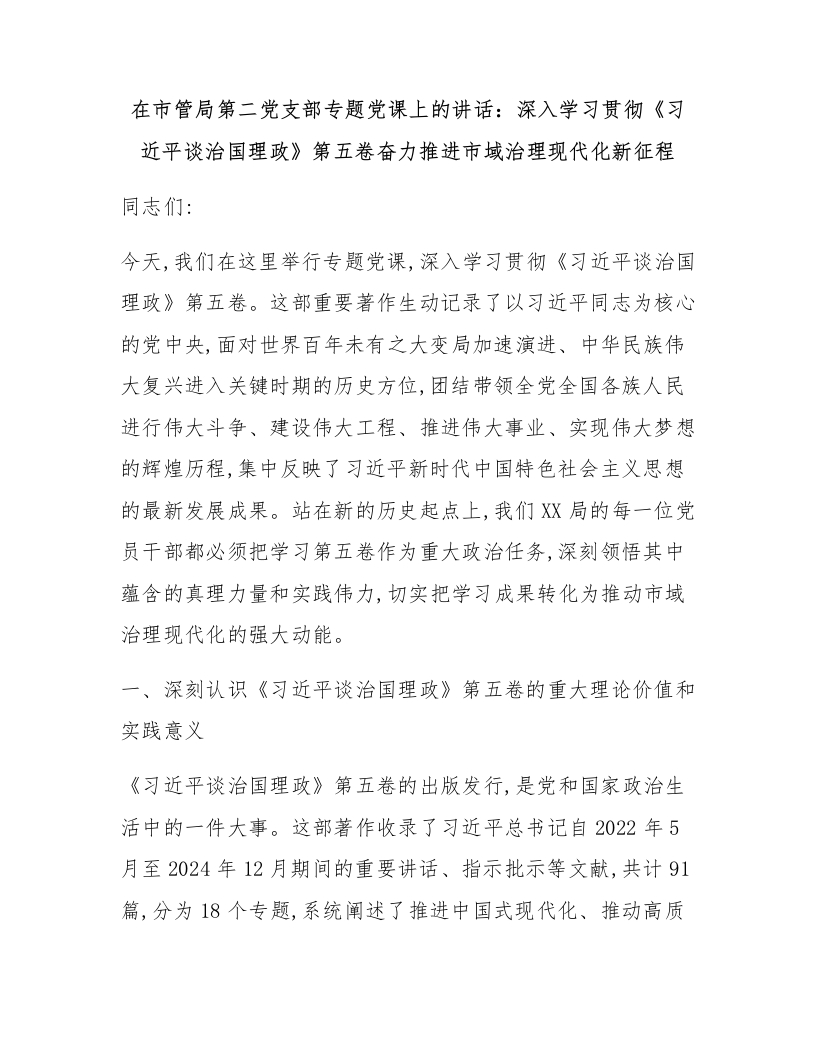 在市管局第二党支部专题党课上的讲话:深入学习贯彻《习近平谈治国理政》第五卷奋力推进市域治理现代化新征程