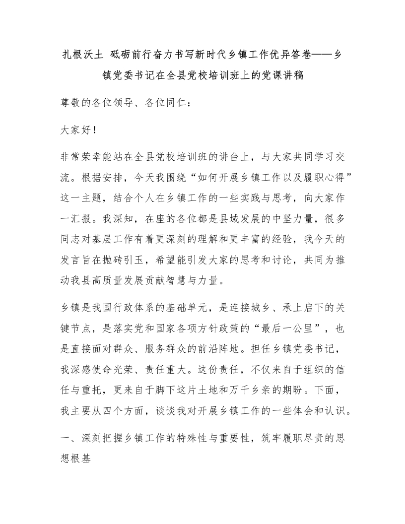 扎根沃土 砥砺前行奋力书写新时代乡镇工作优异答卷——乡镇党委书记在全县党校培训班上的党课讲稿