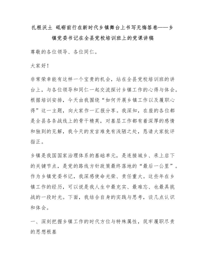 扎根沃土 砥砺前行在新时代乡镇舞台上书写无悔答卷——乡镇党委书记在全县党校培训班上的党课讲稿