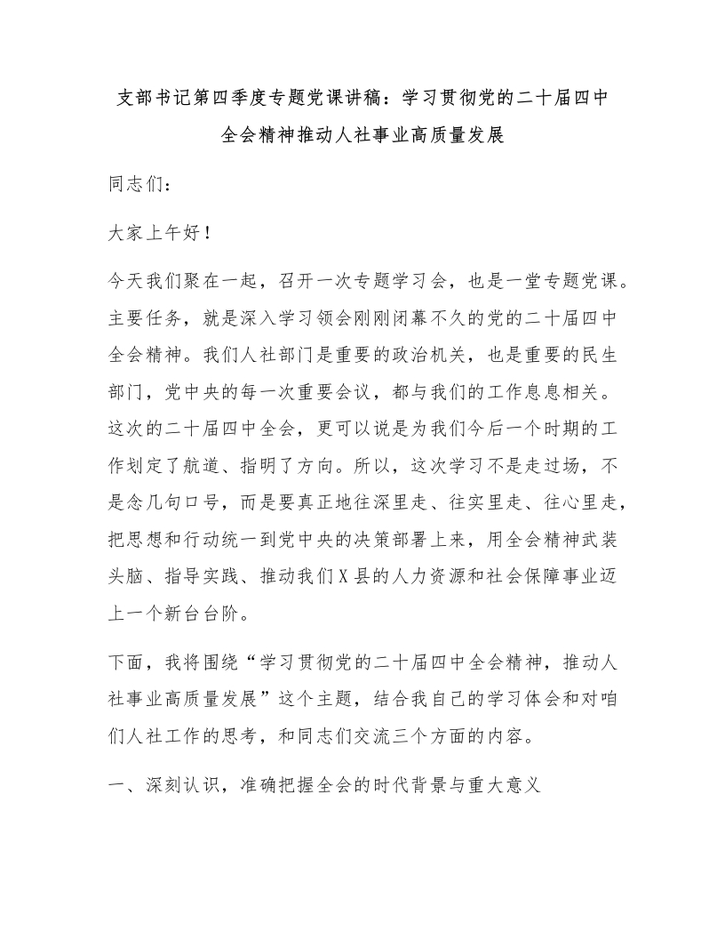 支部书记第四季度专题党课讲稿:学习贯彻党的二十届四中全会精神推动人社事业高质量发展