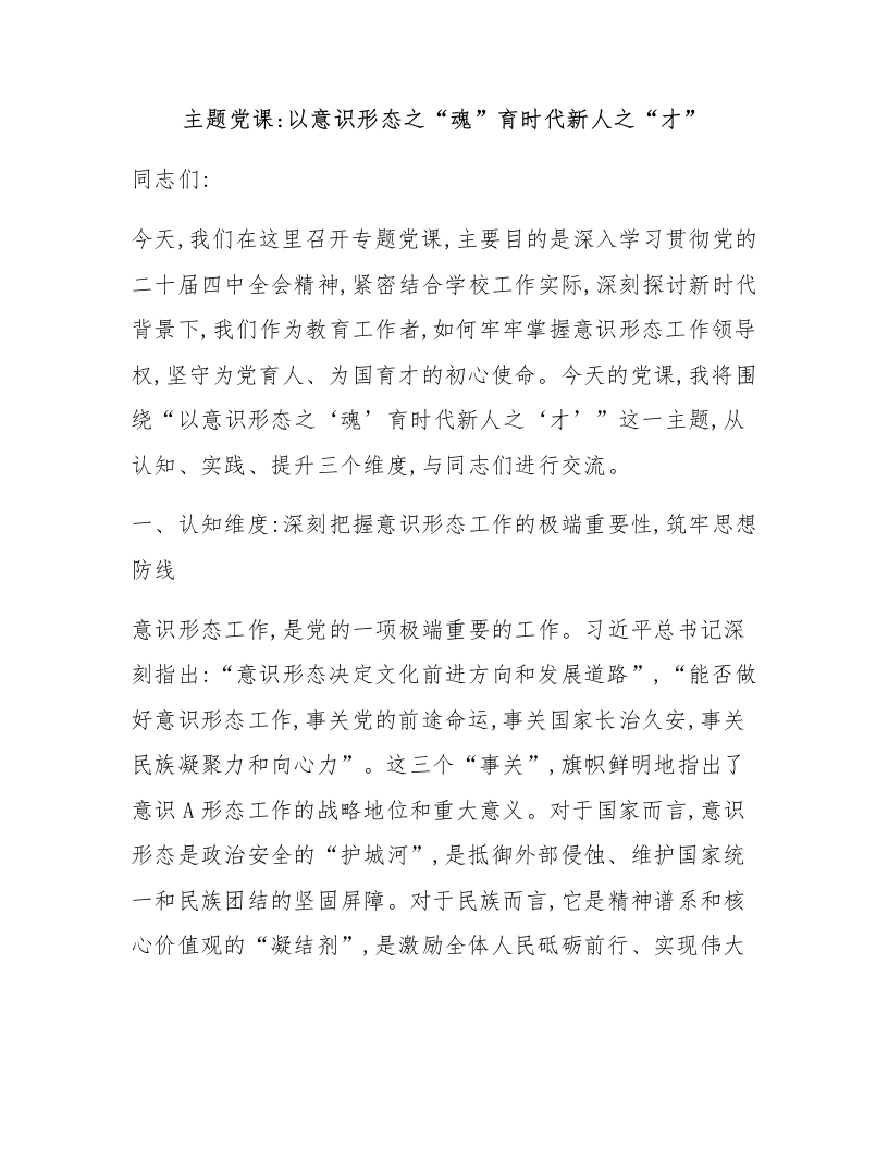 主题党课:以意识形态之“魂”育时代新人之“才”