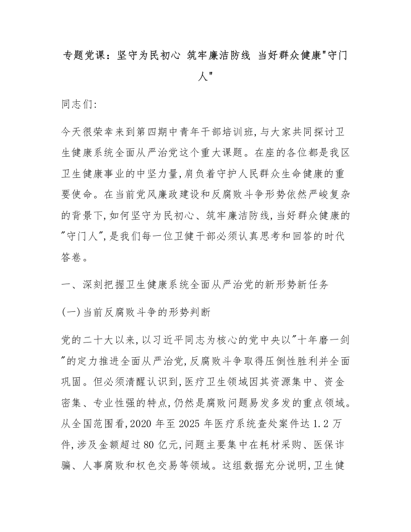 专题党课:坚守为民初心 筑牢廉洁防线 当好群众健康“守门人“
