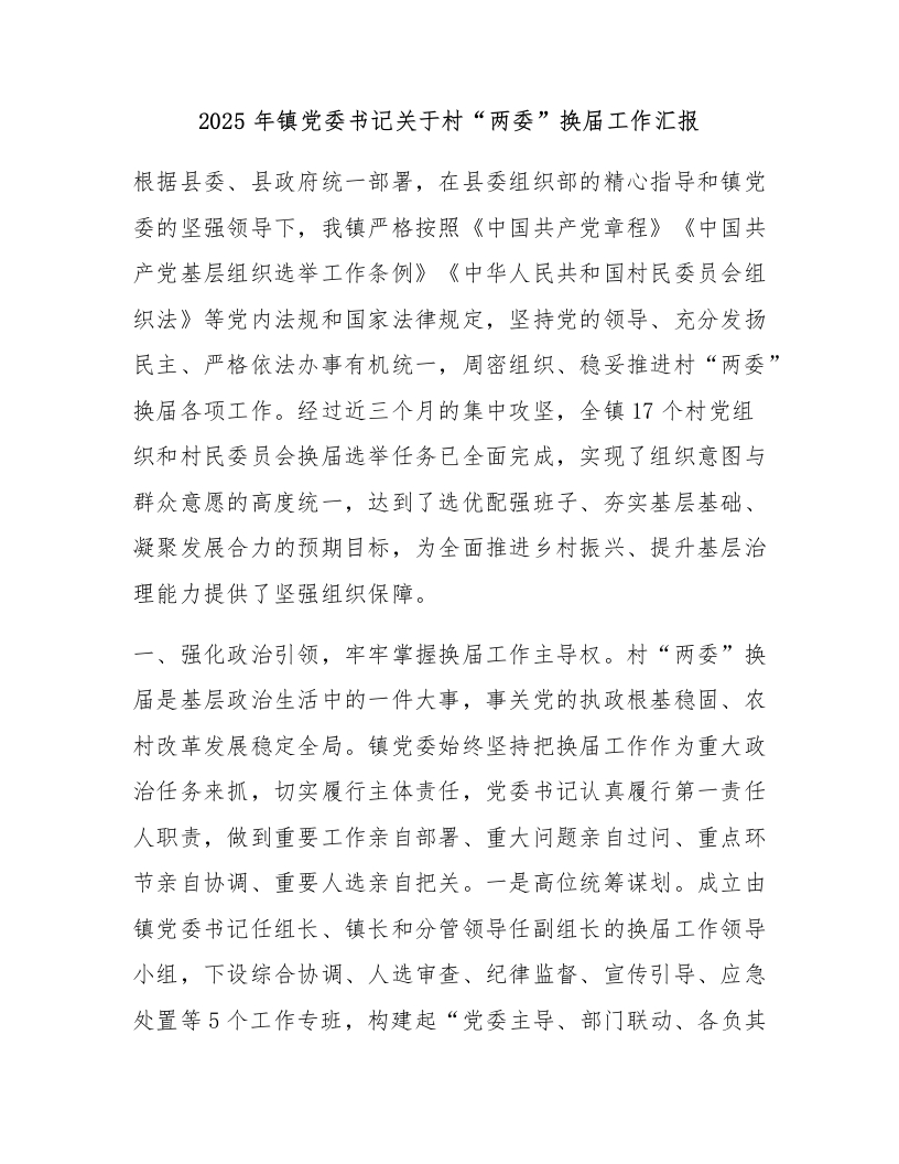 2025年镇党委书记关于村“两委”换届工作汇报