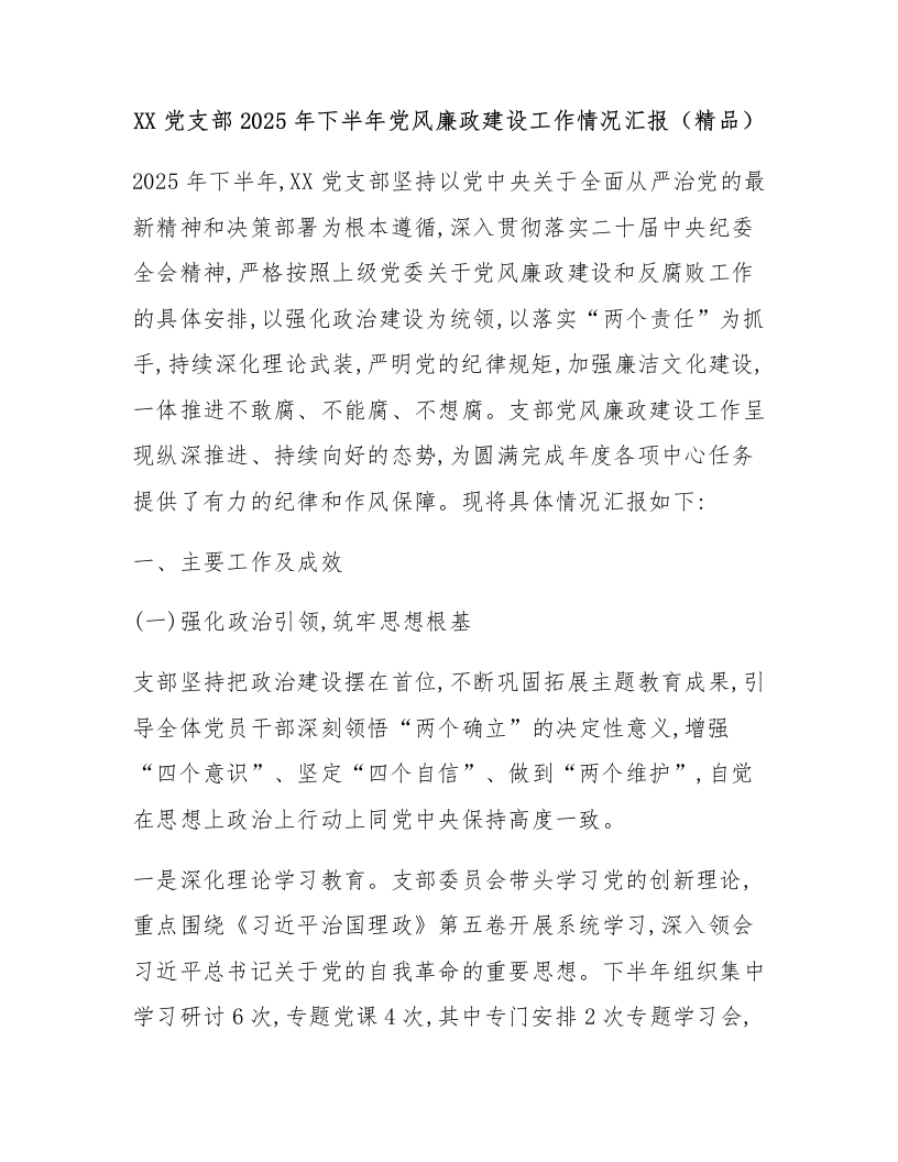XX党支部2025年下半年党风廉政建设工作情况汇报(精品)