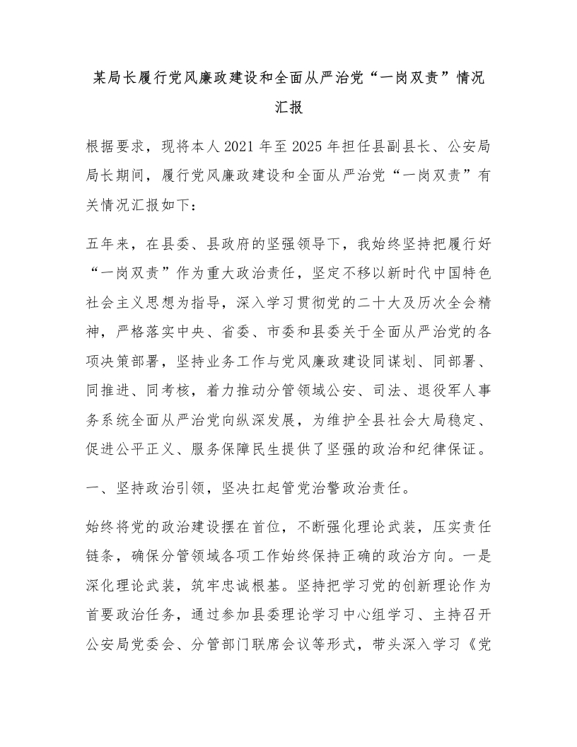 首页报告总结工作汇报某局长履行党风廉政建设和全面从严治党“一岗双责”情况汇报