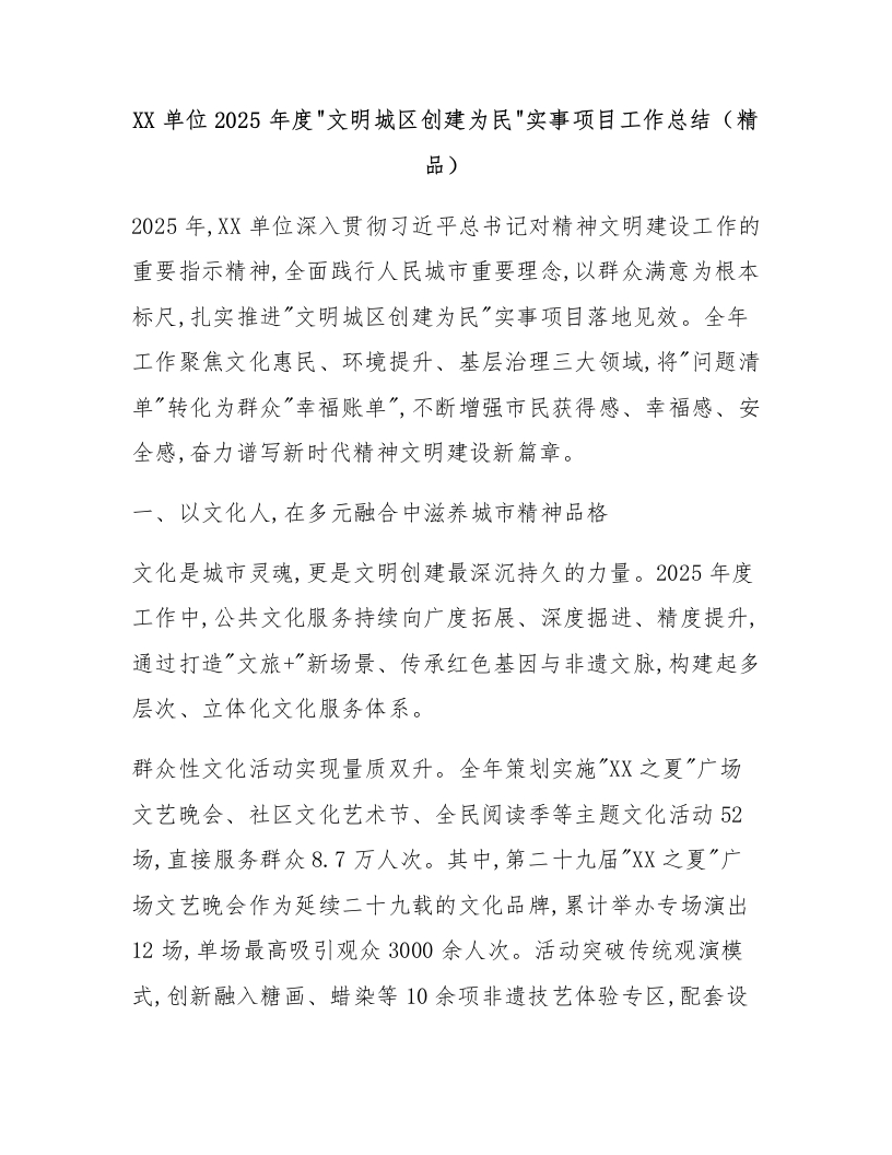 XX单位2025年度“文明城区创建为民“实事项目工作总结(精品)
