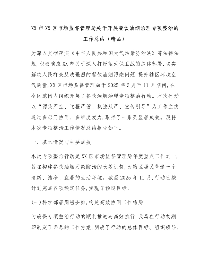XX市XX区市场监督管理局关于开展餐饮油烟治理专项整治的工作总结(精品)