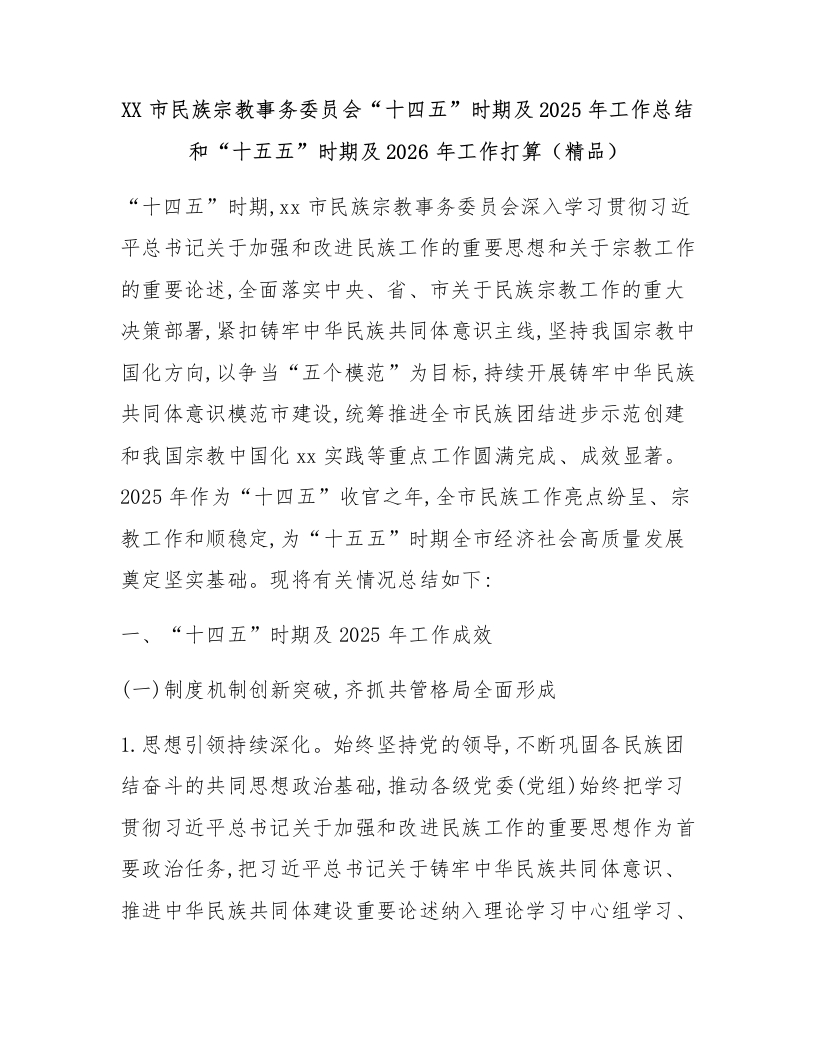 XX市民族宗教事务委员会“十四五”时期及2025年工作总结和“十五五”时期及2026年工作打算(精品)