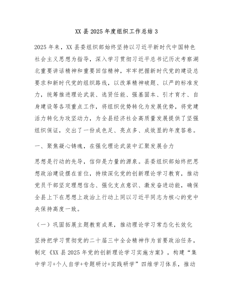 首页热门分类工作总结XX县2025年度组织工作总结3