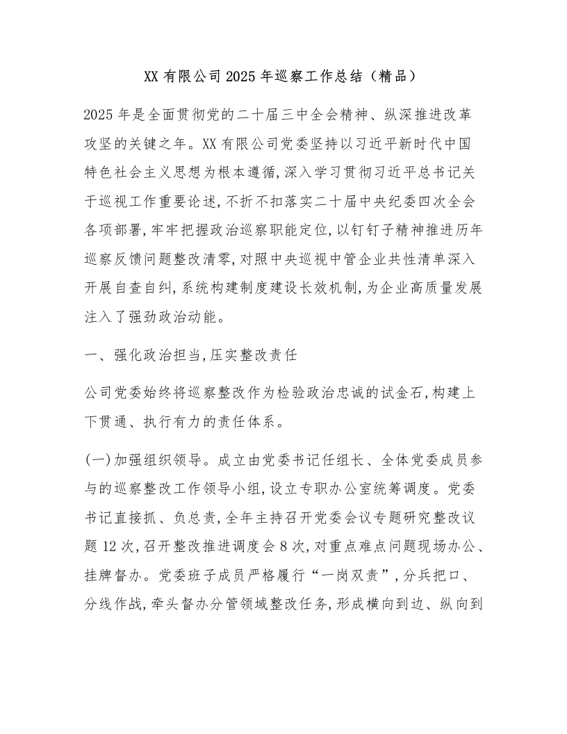 首页热门分类工作总结XX有限公司2025年巡察工作总结(精品)