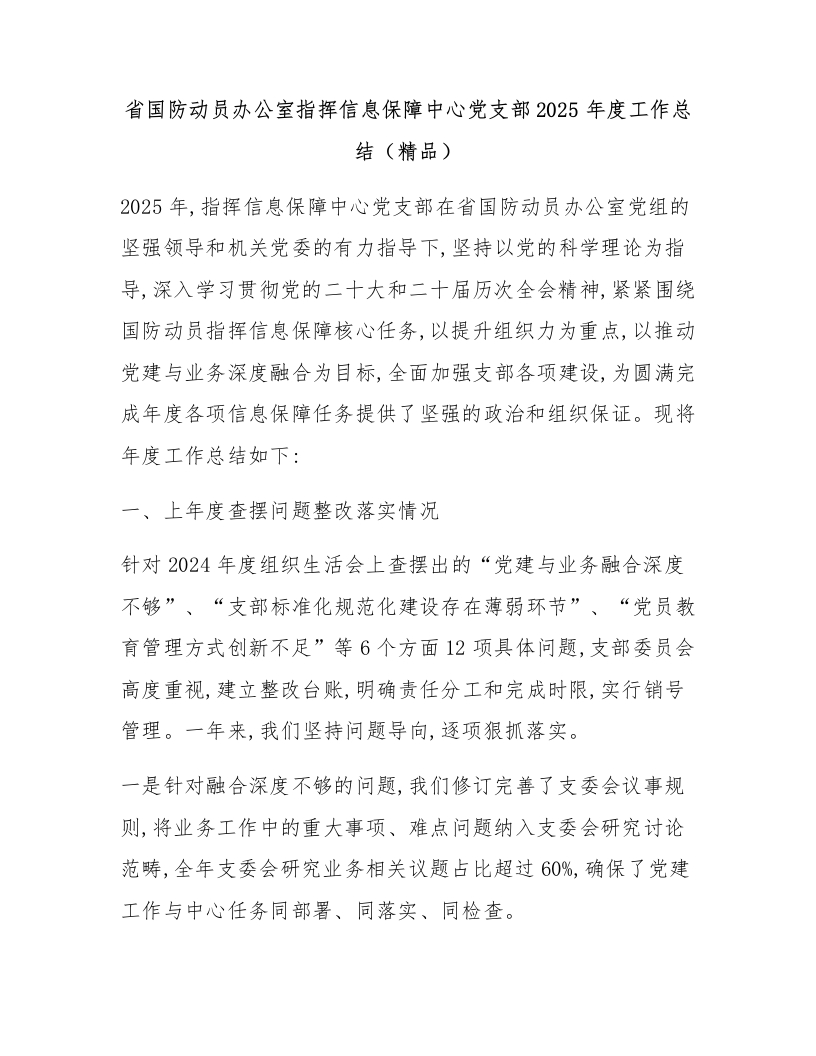 首页热门分类工作总结省国防动员办公室指挥信息保障中心党支部2025年度工作总结(精品)