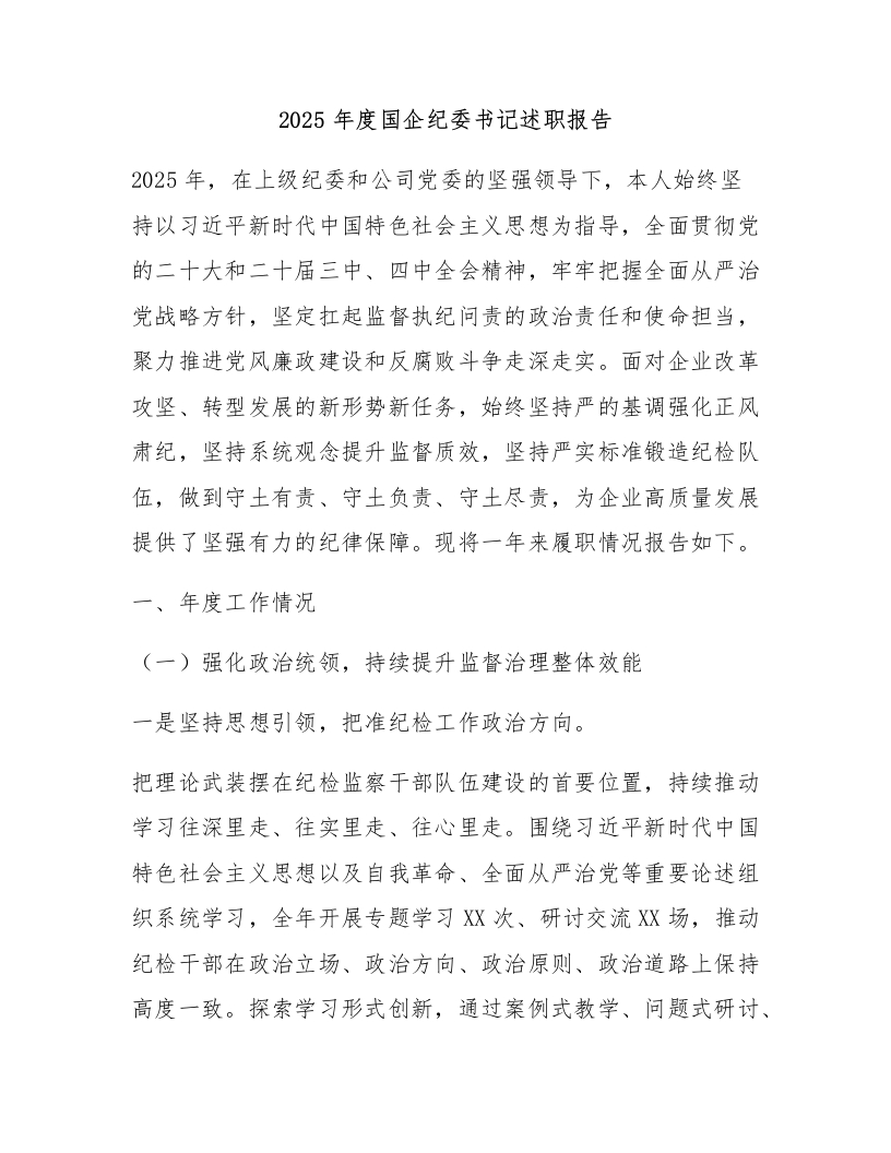 首页国企银行专区国企材料2025年度国企纪委书记述职报告