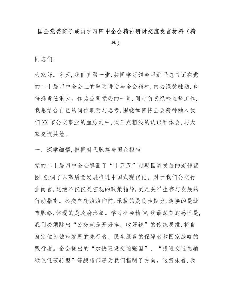 国企党委班子成员学习四中全会精神研讨交流发言材料(精品)