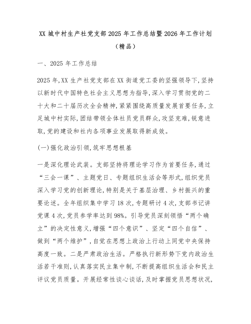 XX城中村生产社党支部2025年工作总结暨2026年工作计划(精品)
