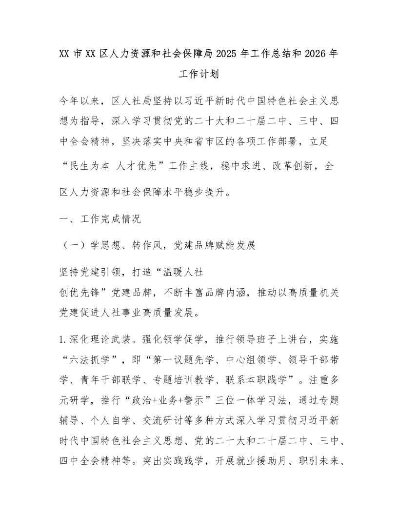 XX市XX区人力资源和社会保障局2025年工作总结和2026年工作计划