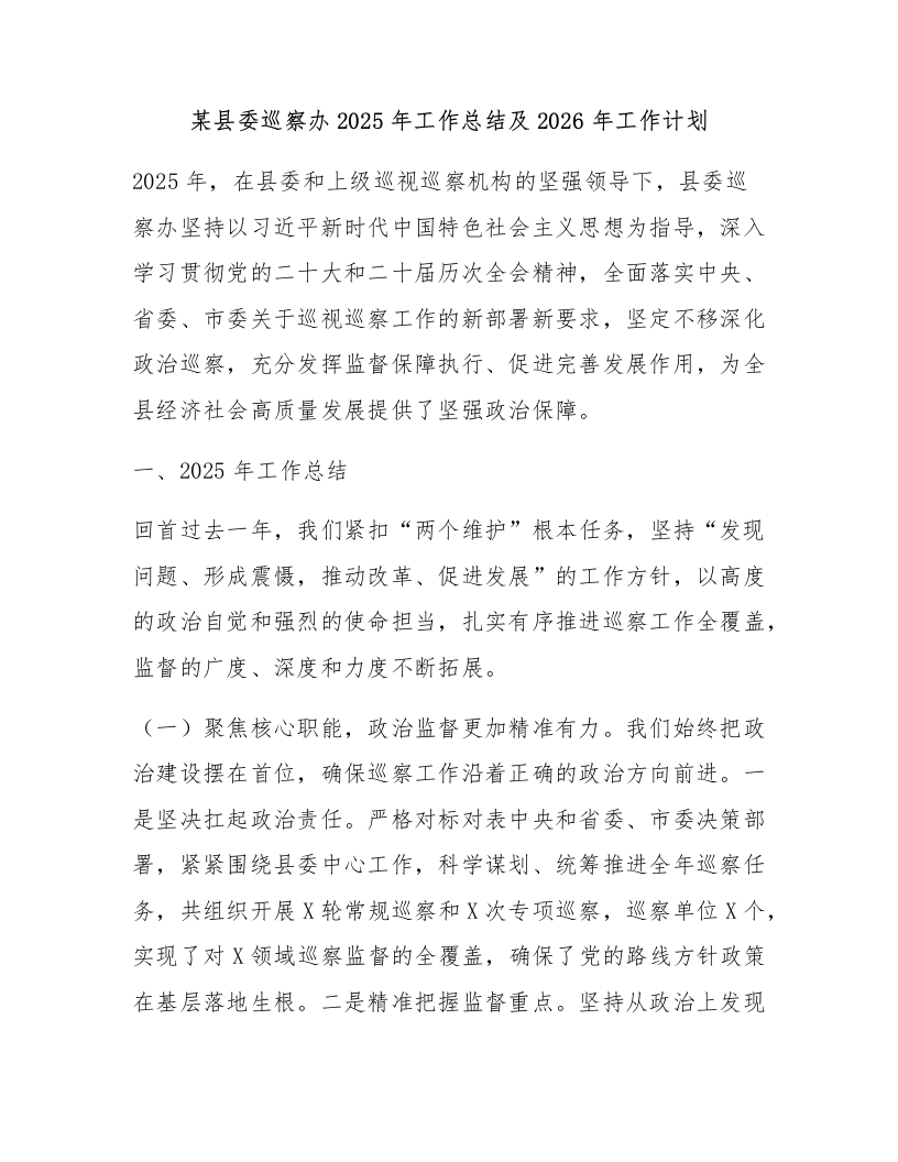 某县委巡察办2025年工作总结及2026年工作计划