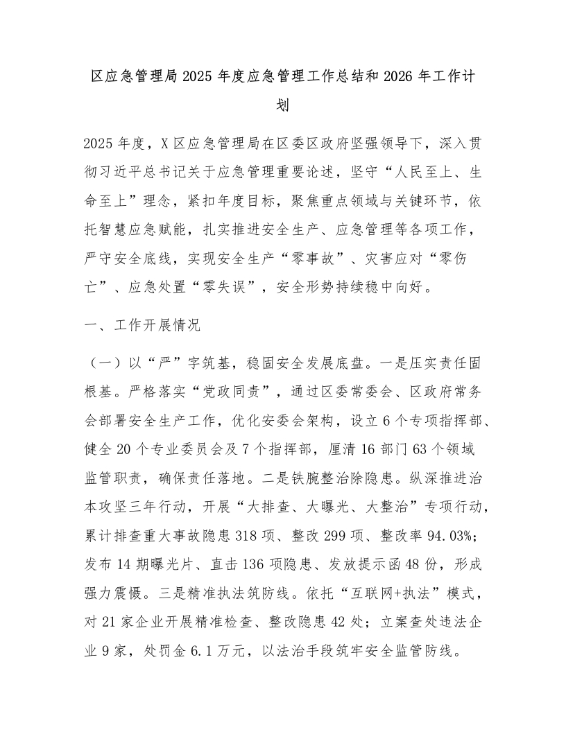 首页报告总结计划方案区应急管理局2025年度应急管理工作总结和2026年工作计划