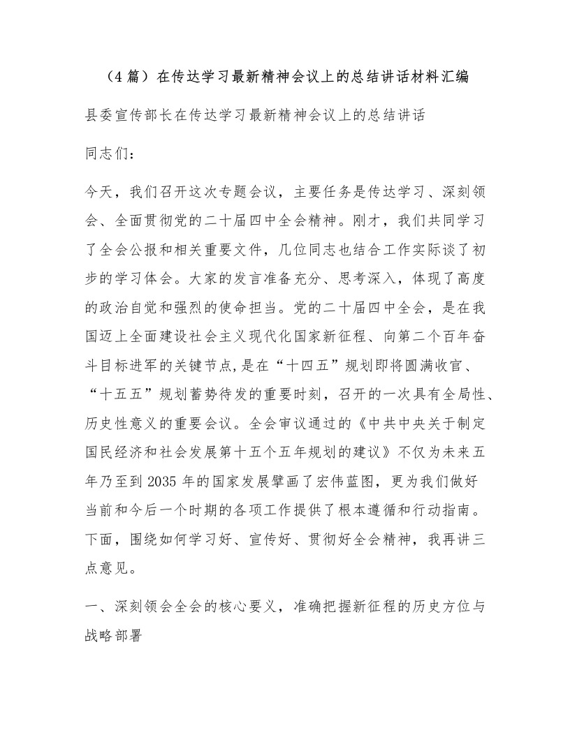 (4篇)在传达学习最新精神会议上的总结讲话材料汇编