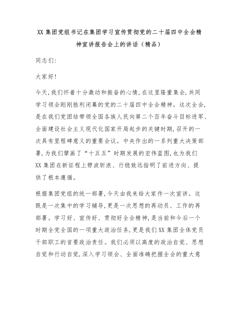 XX集团党组书记在集团学习宣传贯彻党的二十届四中全会精神宣讲报告会上的讲话(精品)
