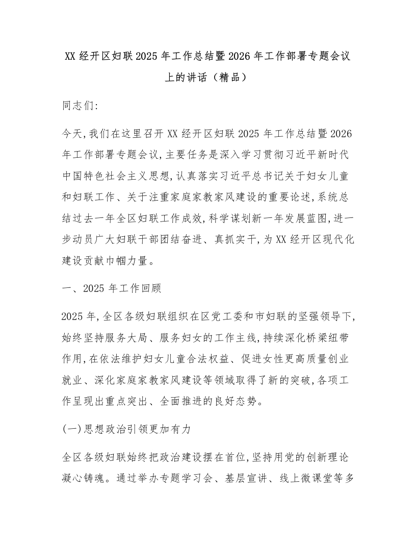 XX经开区妇联2025年工作总结暨2026年工作部署专题会议上的讲话(精品)