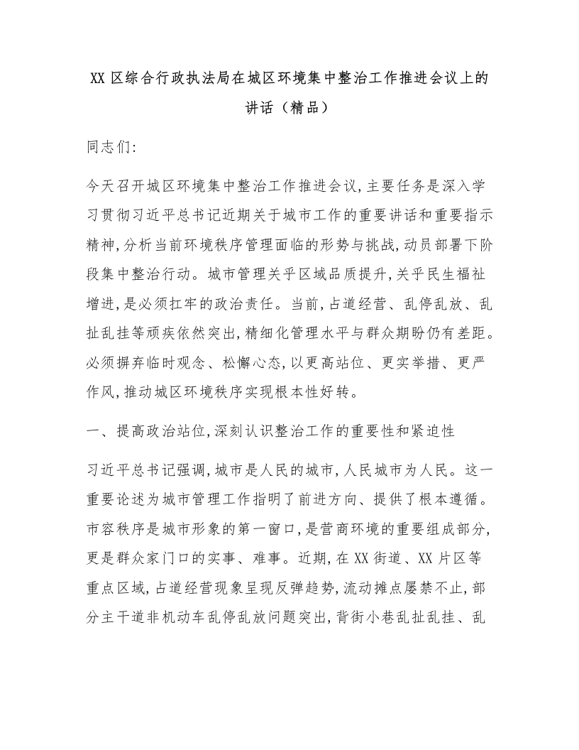 XX区综合行政执法局在城区环境集中整治工作推进会议上的讲话(精品)