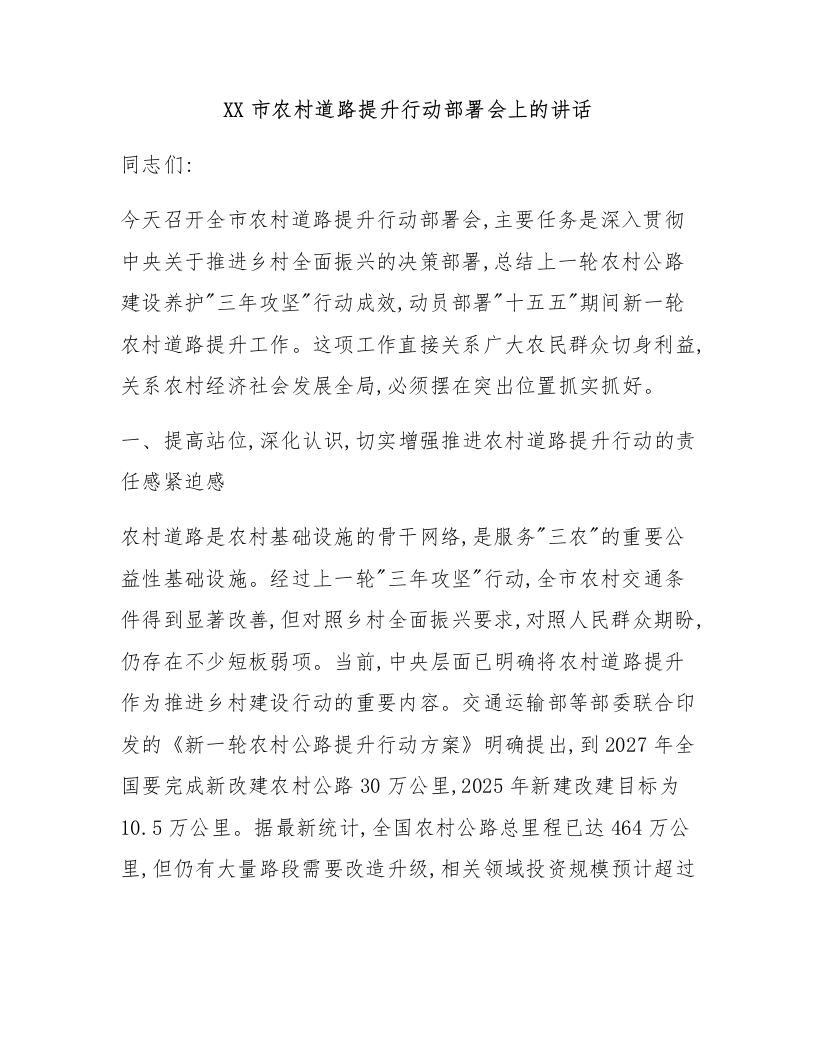 首页领导发言领导讲话XX市农村道路提升行动部署会上的讲话