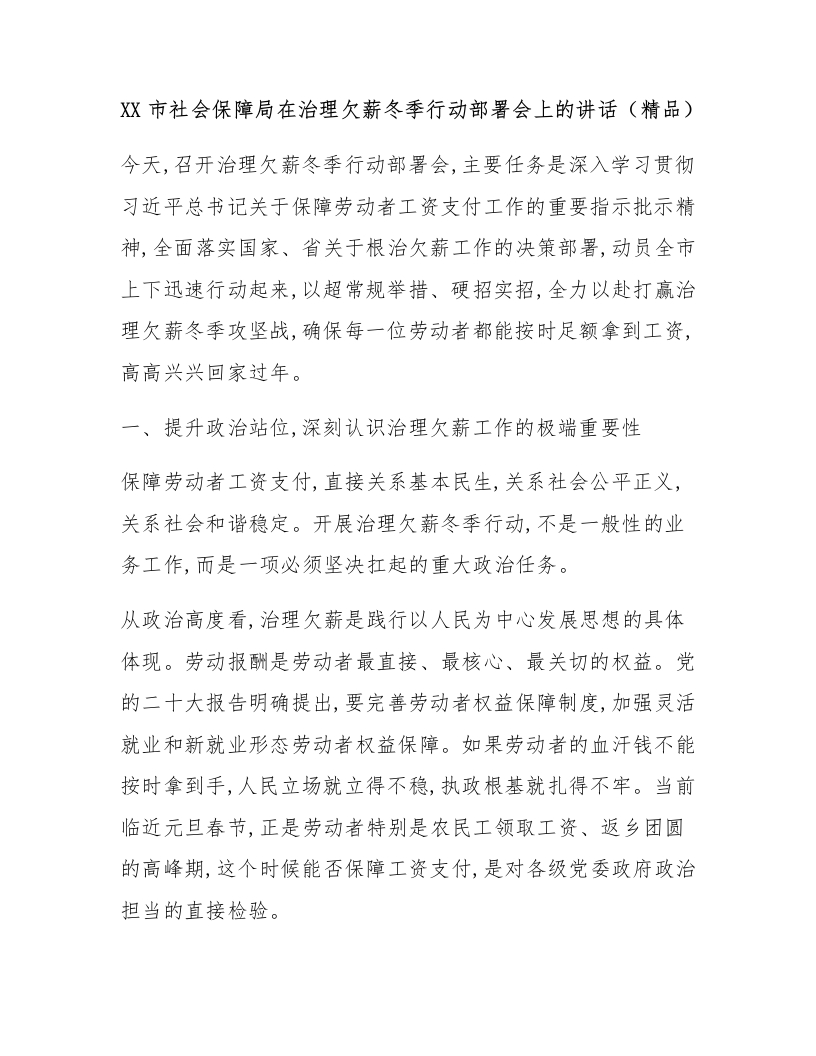 XX市社会保障局在治理欠薪冬季行动部署会上的讲话(精品)