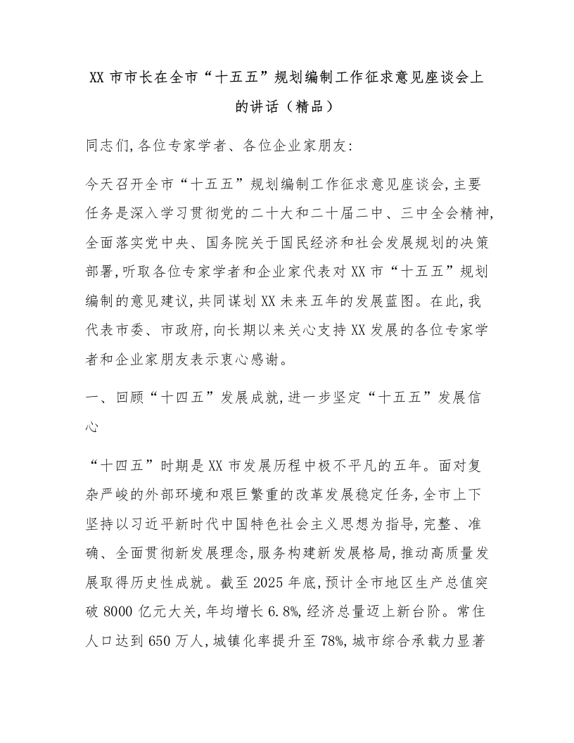 首页领导发言领导讲话XX市市长在全市“十五五”规划编制工作征求意见座谈会上的讲话(精品)