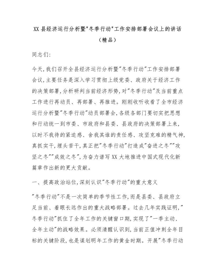 XX县经济运行分析暨“冬季行动“工作安排部署会议上的讲话(精品)