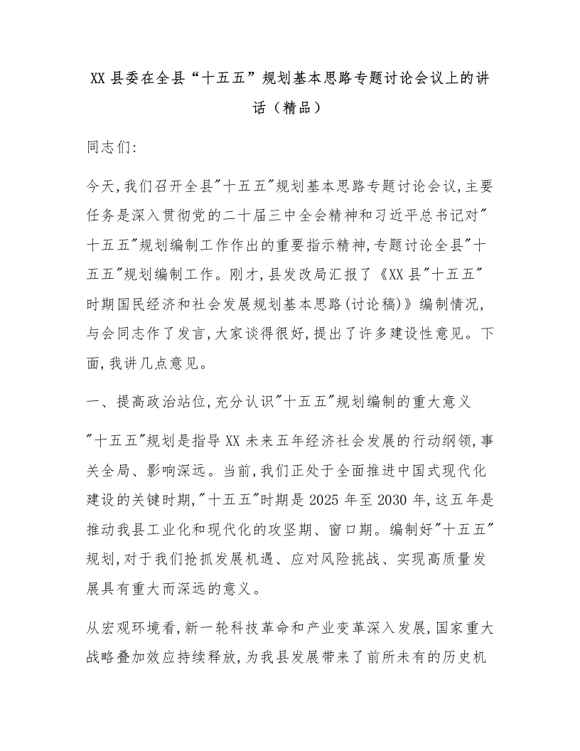 XX县委在全县“十五五”规划基本思路专题讨论会议上的讲话(精品)