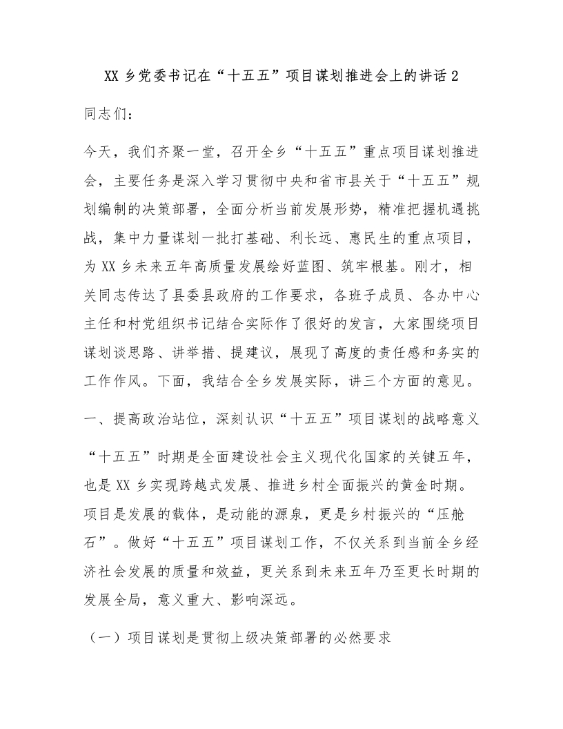 XX乡党委书记在“十五五”项目谋划推进会上的讲话2