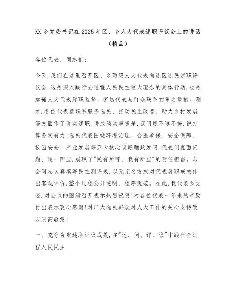 XX乡党委书记在2025年区、乡人大代表述职评议会上的讲话(精品)