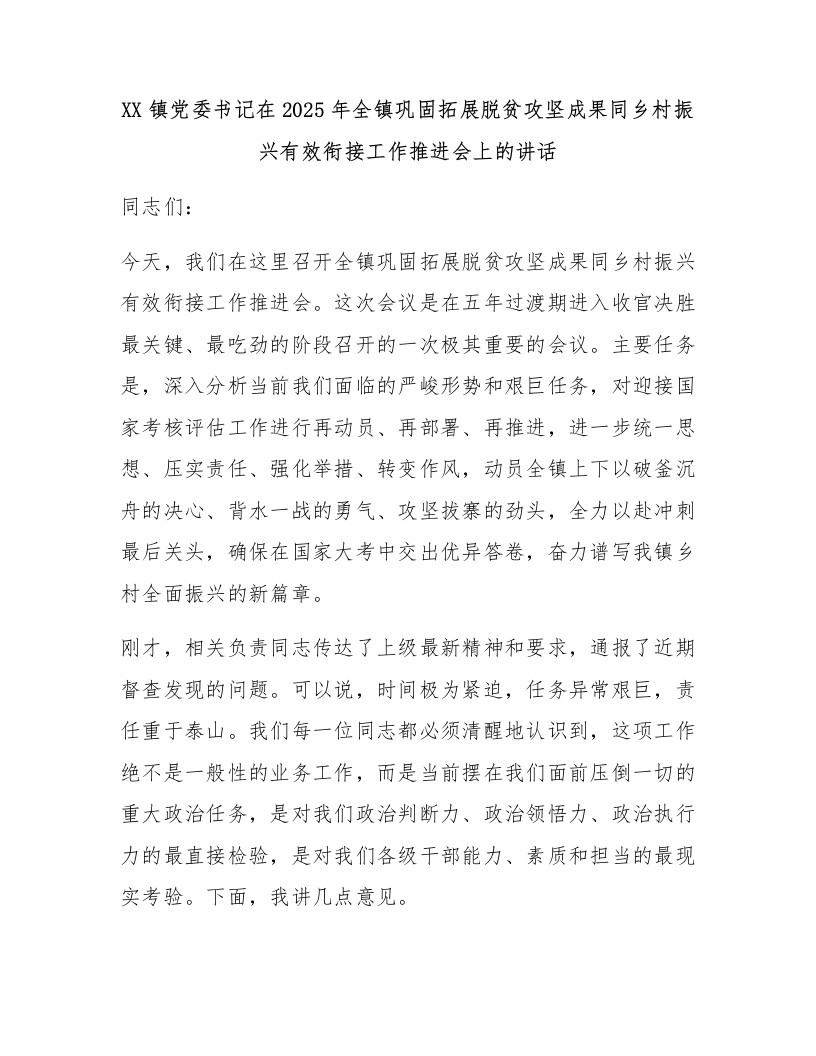 XX镇党委书记在2025年全镇巩固拓展脱贫攻坚成果同乡村振兴有效衔接工作推进会上的讲话