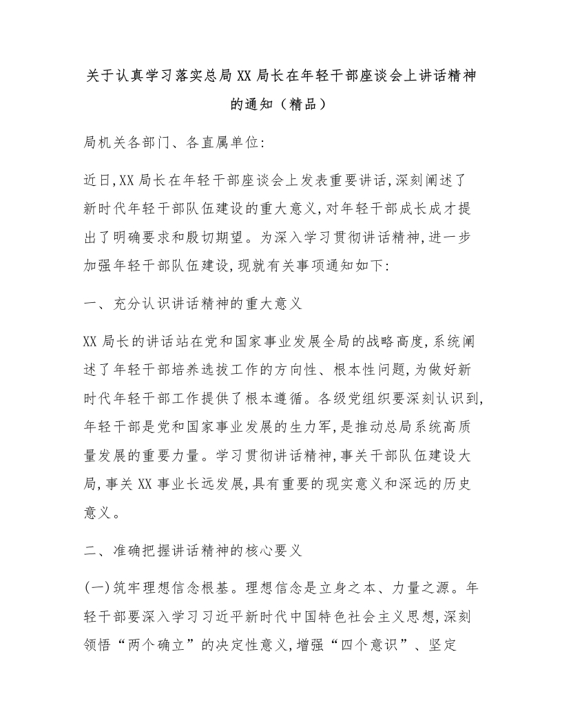 首页领导发言领导讲话关于认真学习落实总局XX局长在年轻干部座谈会上讲话精神的通知(精品)