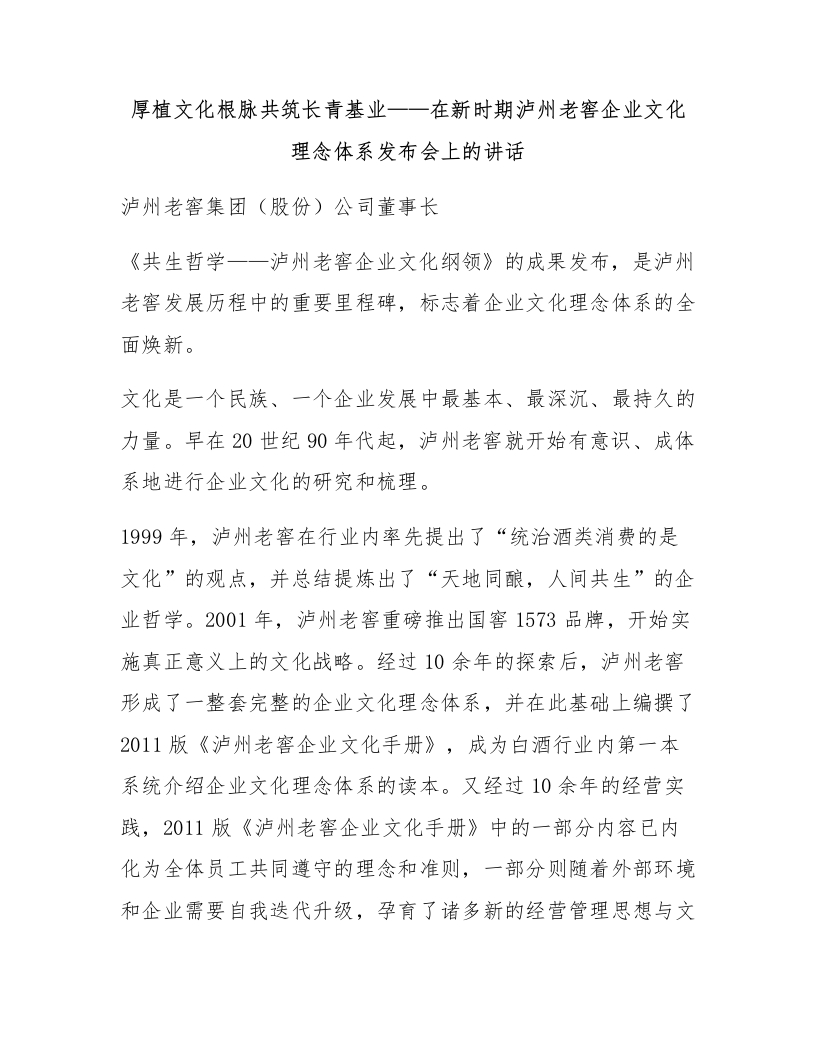 厚植文化根脉共筑长青基业——在新时期泸州老窖企业文化理念体系发布会上的讲话