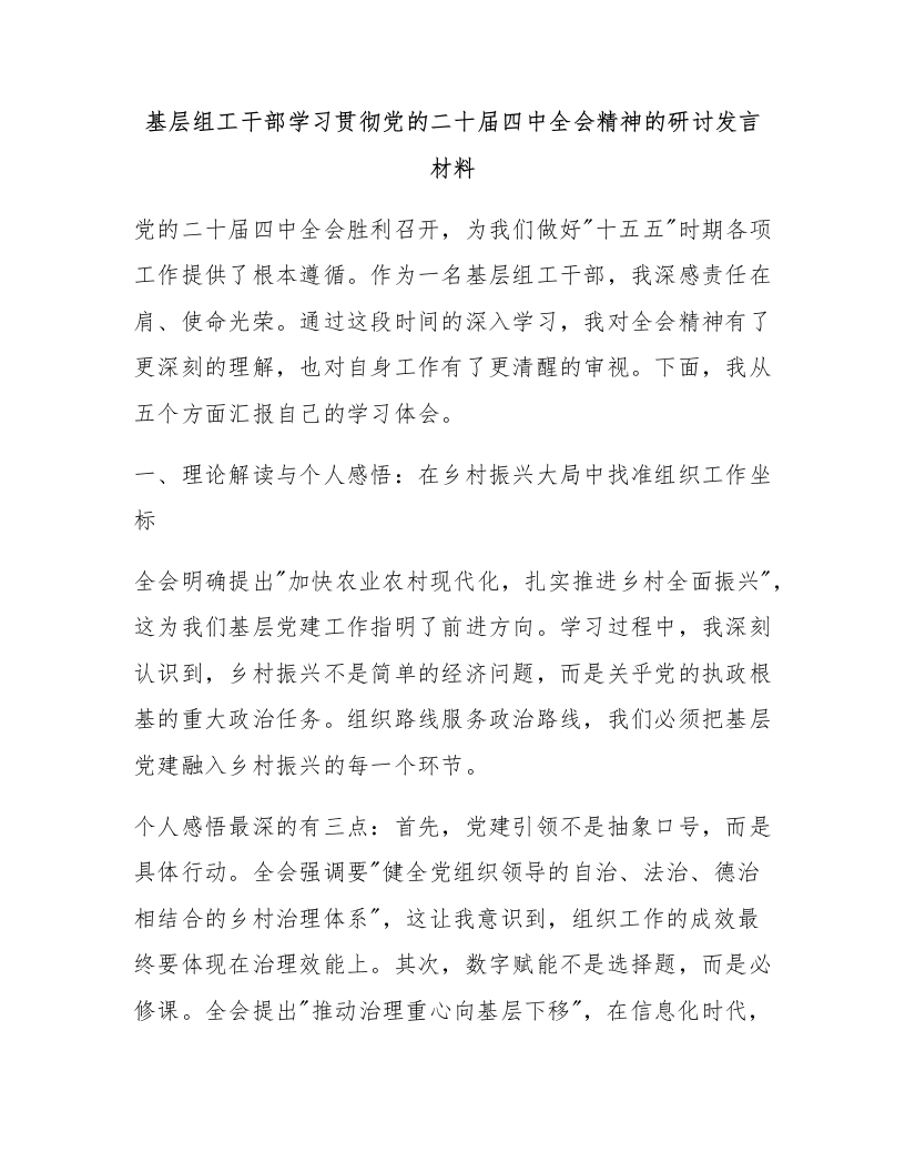 基层组工干部学习贯彻党的二十届四中全会精神的研讨发言材料