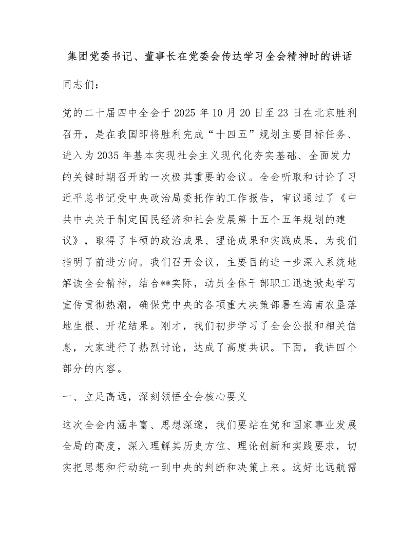 集团党委书记、董事长在党委会传达学习全会精神时的讲话