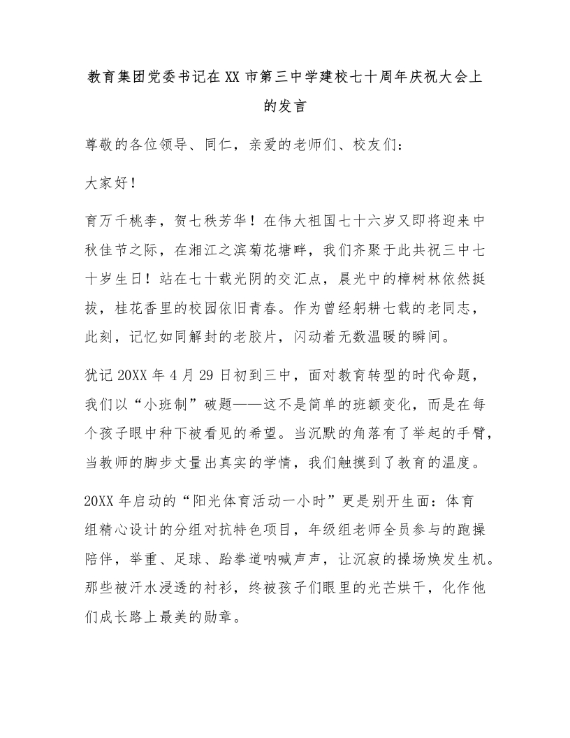 教育集团党委书记在XX市第三中学建校七十周年庆祝大会上的发言