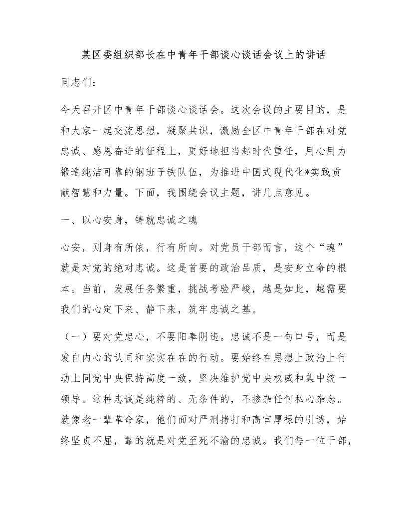 某区委组织部长在中青年干部谈心谈话会议上的讲话